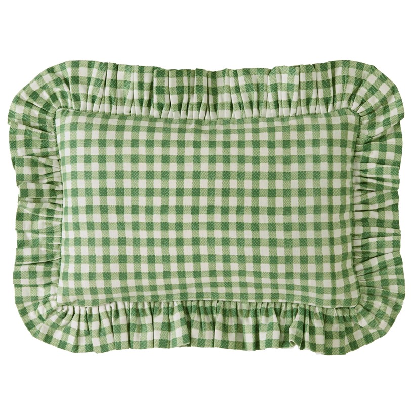Sitting on a beautiful, soft sage ground with cheerful ruffle edge made from a beautiful green gingham check.
