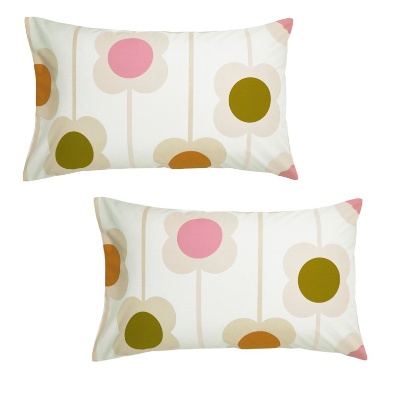Printed onto a 200 thread count cotton percale base, Orla Kiely’s classic design is recolored in warm neutral shades and paired with pops of pink, orange, green for a colorful, retro look.
