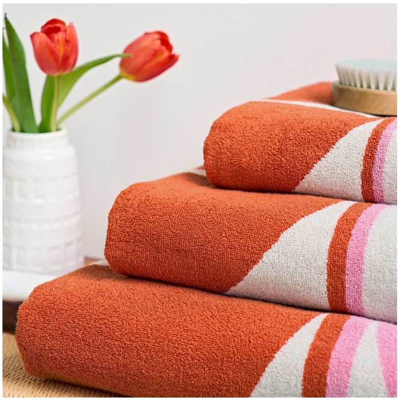 These woven towels are finished with a burnt orange bordered edge to add a playful touch to your bathroom.