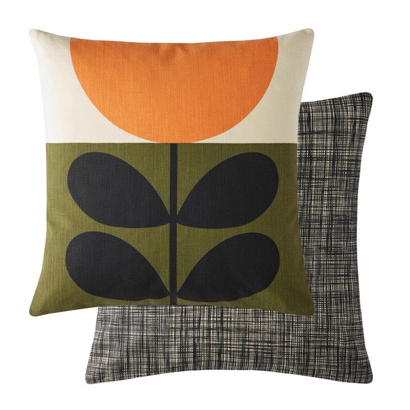 In a mid-century inspired colour palette of warm cream, olive green and bright orange, this cushion features Orla Kiely’s signature Scribble print texture on the reverse.
