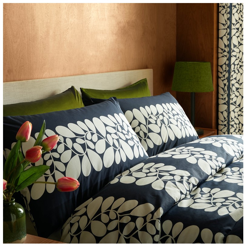Creating movement with its vine-like shape, this bold design uses graphic shapes inspired by sycamore tree seeds, in a timeless combination of navy blue and cream, printed onto a 200 thread count 100% cotton base.