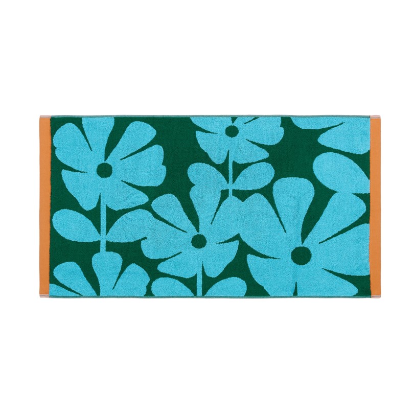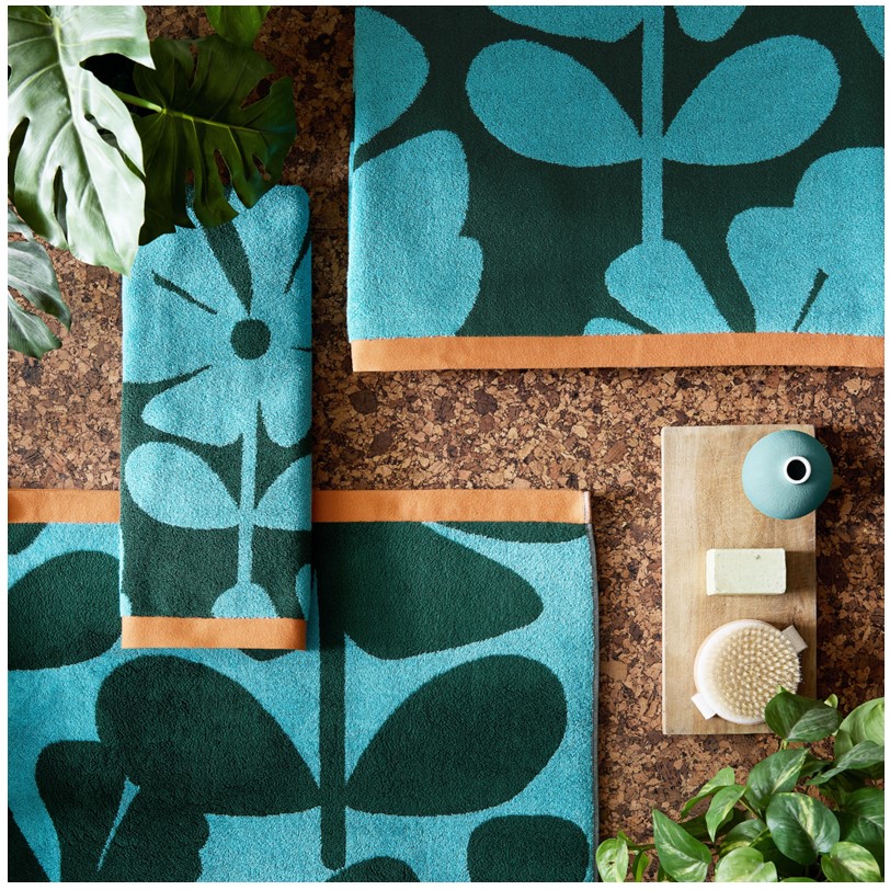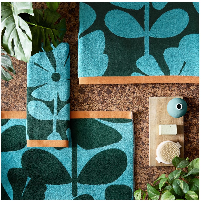 Deep jade green and bright sky-blue yarns, finished with a contrast border trim in a pop of orange, these towels are perfect for brightening your bathroom