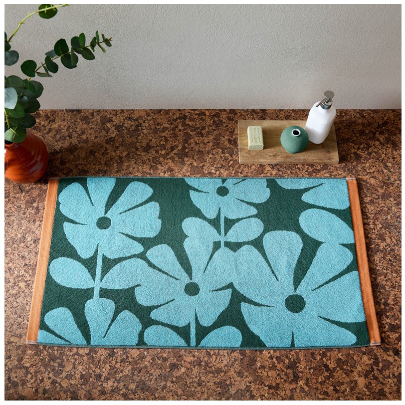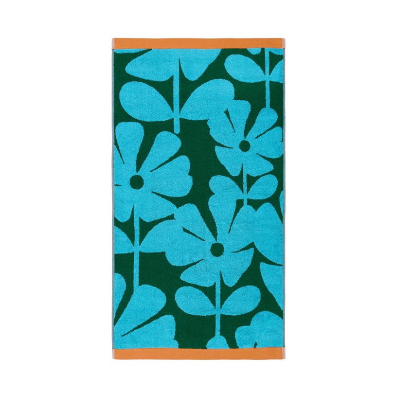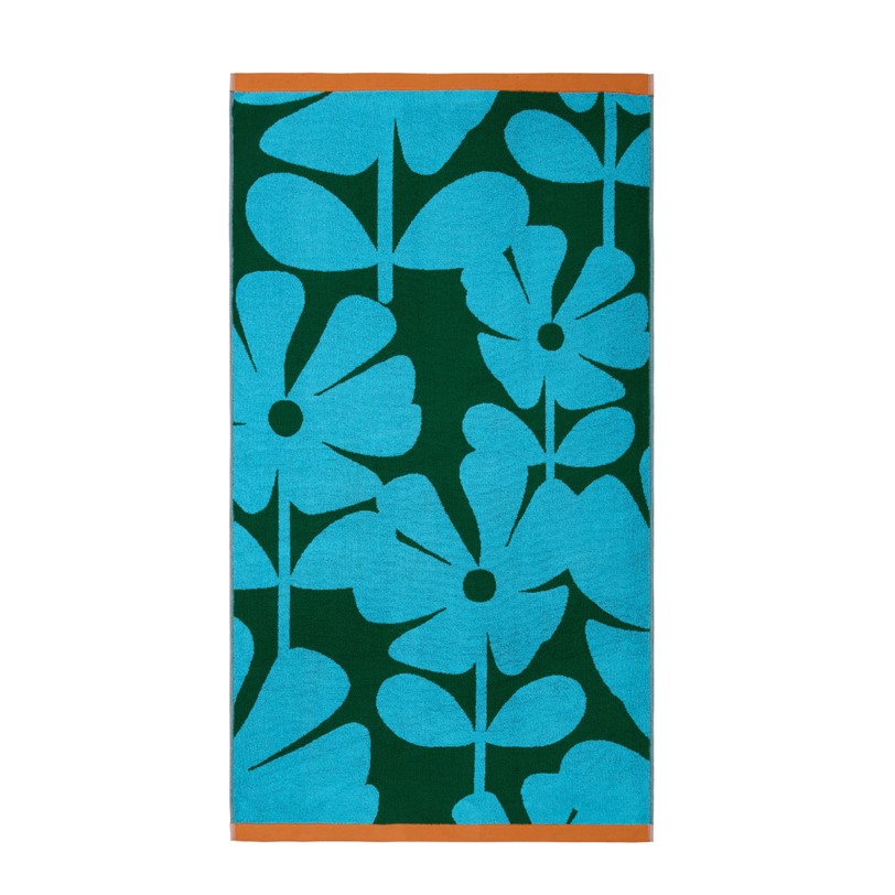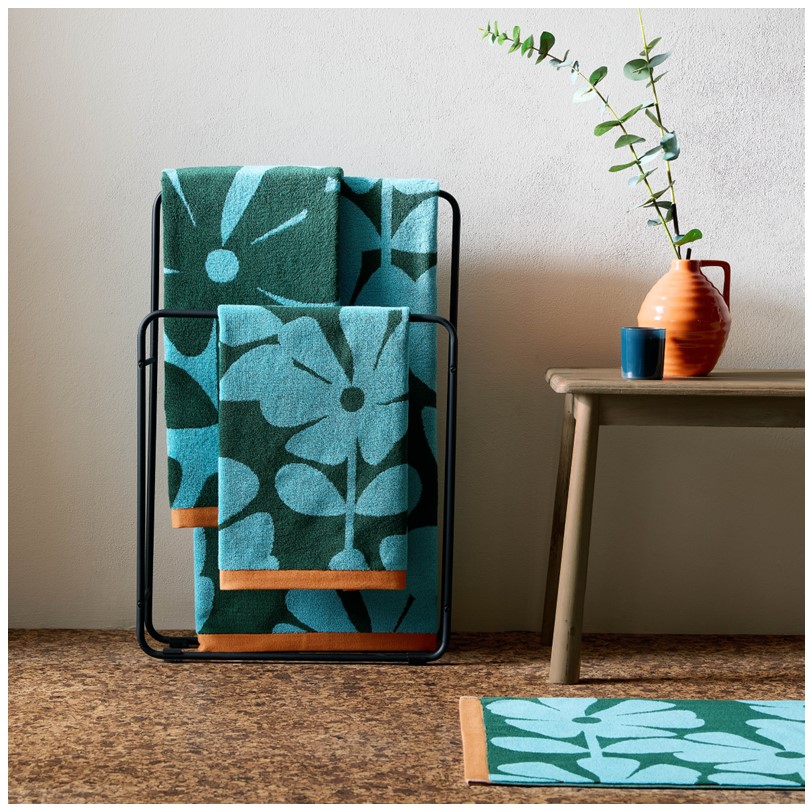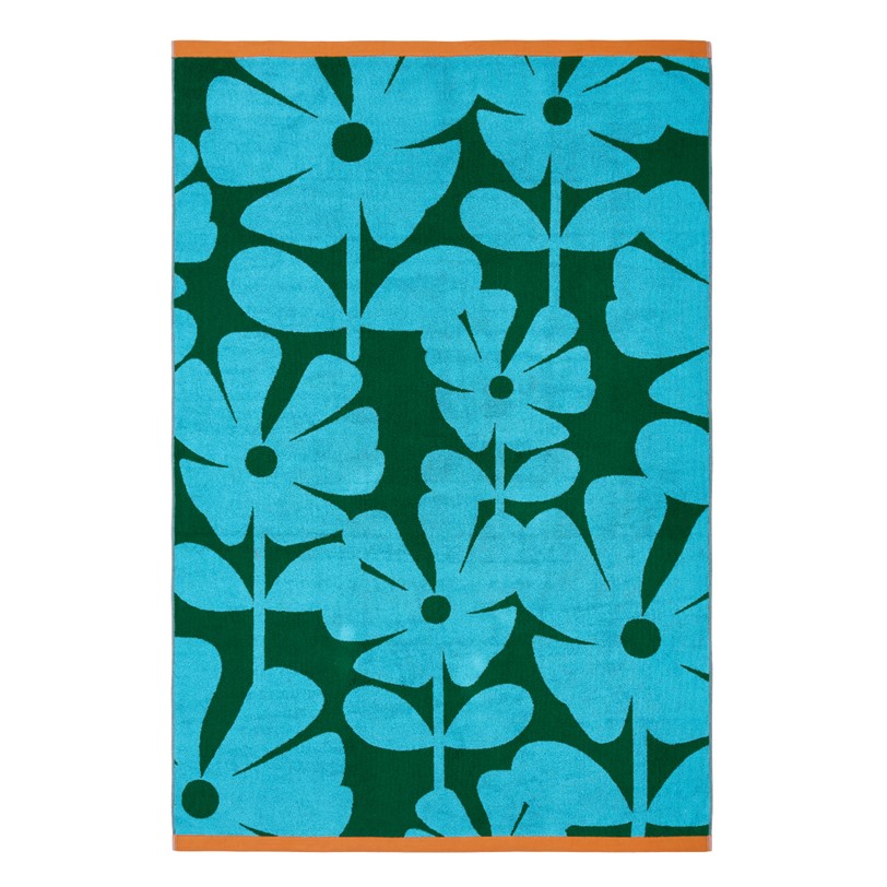 Deep jade green and bright sky-blue yarns are woven together in Orla Kiely’s vibrant, retro floral design.