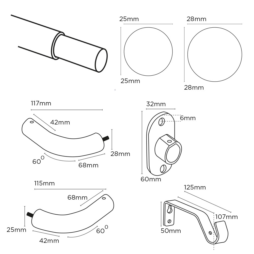 25-28mm Metal extendable curtain pole complete set, featuring curved ends to sit flush against the wall to help insulate the room.